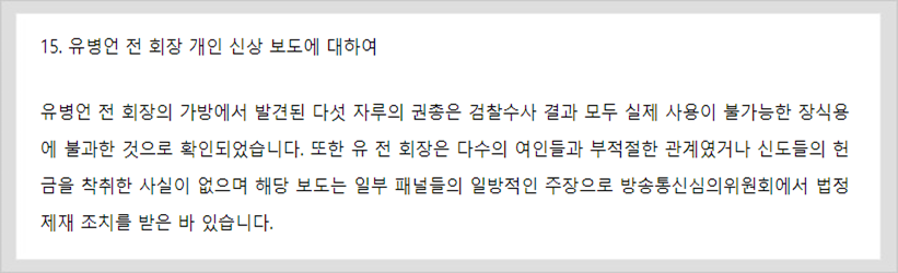 15. 유병언 전 회장 개인 신상 보도에 대하여 유병언 전 회장의 가방에서 발견된 다섯 자루의 권총은 검찰수사 결과 모두 실제 사용이 불가능한 장식용에 불과한 것으로 확인되었습니다. 또한 유 전 회장은 다수의 여인들과 부적절한 관계였거나 신도들의 헌금을 착취한 사실이 없으며 해당 보도는 일부 패널들의 일방적인 주장으로 방송통신심의위원회에서 법정 제재 조치를 받은 바 있습니다.
