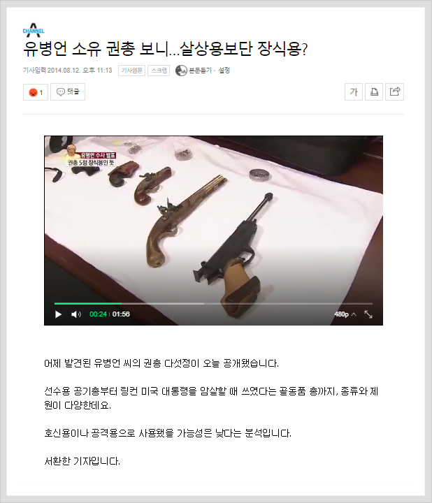 | 유병언 전 회장의 가방에서 발견된 다섯 자루의 권총은 검찰수사 결과 모두 실제 사용이 불가능한 장식용에 불과한 것으로 확인되었다. |