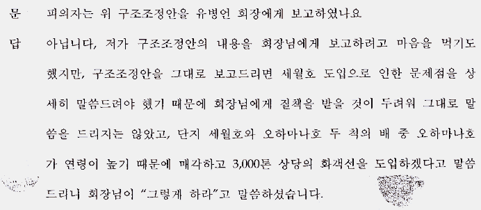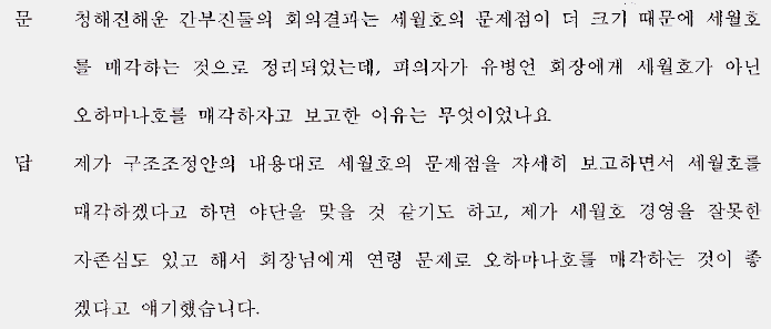 | 유병언 전 회장 쪽은 청해진해운 김한식 사장은 당시 ‘오하마나호나 세월호 중 하나를 팔고 화객선을 구입하자는 의견’을 보고하여, 이에 유 전 회장이 ‘선령이 25년을 초과하는 오하마나호를 먼저 매각하라’고 지시했을 뿐, 세월호 매각 의견을 일축하거나 반대한 바 없다. 실제 검찰 조사에서 김한식 사장은 사직서나 세월호와 오하마나호의 제주항로 구조조정안을 가지고 들어가기만 했을 뿐 제출하지도 않았고, 구체적으로 해당 문제에 대해 언급하지도 않았다고 진술한 것으로 확인되었다. |