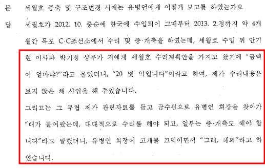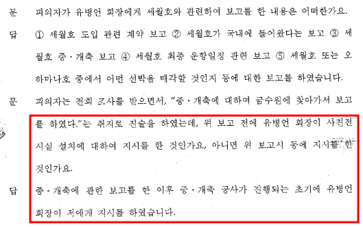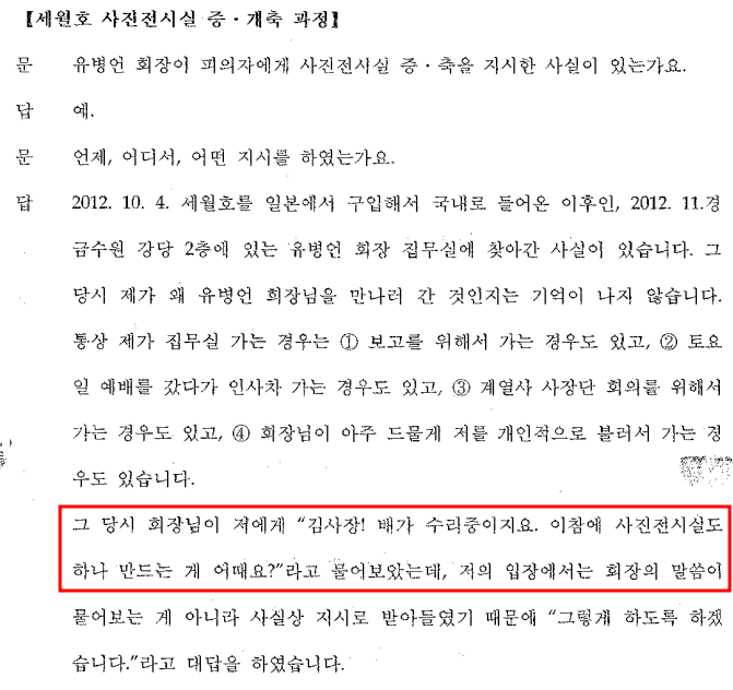 | 청해진해운은 나미노우에호 도입을 추진할 때부터 이미 “증·개축을 계획”했었으며, 안기현은 증개축이 가능한지 신성선박설계에 타당성 검사를 의뢰해 문제가 없다는 답변을 들어 증개축을 진행한 것으로 밝혀졌다. 다만, 사진전시실은 증개축이 진행되고 있던 초기에 유병언 전 회장의 의견에 따라 증개축 공사에 반영되어 추가된 것이다. 따라서 유병언 회장이 사진전시실을 주 목적으로 하여 세월호 증축을 지시한 사실이 없다. |