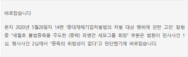 We are correcting our article titled “Law on punishing companies with serious disaster” reported back on May 28th, 2020. We initially reported that Yoo, the former chairman of Semo Group, lead the illegal expansion of the Sewol ferry, but because the court ruled during the first trial of civil case and the second trial of criminal case that “there is no illegality in expansion”, we are correcting our report.