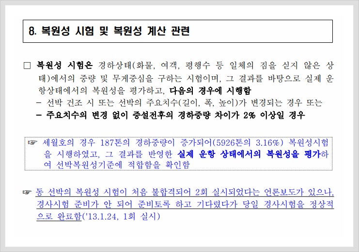 ☞ In the case of the Sewol ferry, a light load of 187 tons was increased (3.16% of 5926 tons), and a stability test was conducted, and the stability in actual operating conditions was evaluated by reflecting the result, confirming that it satisfies the ship restoration standard.