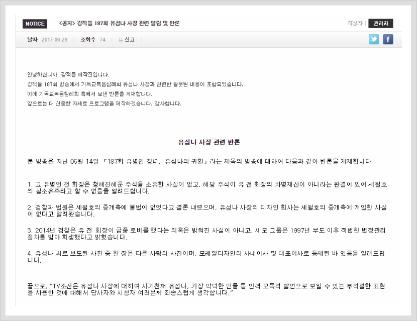 We are posting a counterargument against the broadcast titled "Episode 187 -Return of the Eldest Daughter Yoo Byung-Eun and Yoo Somena" back on June 14th.1. Former Chairman Yoo Byung-eun is not the direct owner ofthe Sewol ferry because there is no factof him owning the shares of Chonghaejin Marine Co., and there is a ruling that the shares are not under the borrowed-name property of former chairman Yoo.2. Prosecutors' office and the court concluded that there was no illegality in the expansion and renovation of the Sewol ferry, and president Yoo Somena's design company reported that there was no fact of intervening in the expansion and renovation of the Sewol ferry.3. In 2014, the prosecutors' office said that there is no evidence revealing that former Chairman Yoo was illegally lobbying with money, and that the Semo Group was revived after going bankrupt in 1997 through legal management procedures.4. One of the photos reported as Yoo Somena is a photograph of another person, and we inform you that she has been listed as the executive director and director of Moreal Design.Lastly, TV Chosun apologizes to both Yoo Somena and viewersfor using inappropriate expressions that can be seen as blasphemous remarks,such as Yoo Somena is a fraudulent genius and the most vicious person.
