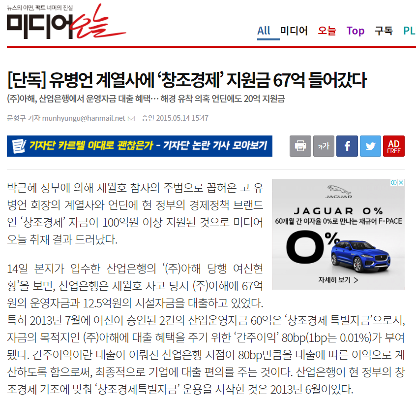 출처: 미디어오늘 <[단독] 유병언 계열사에 ‘창조경제’ 지원금 67억 들어갔다>
