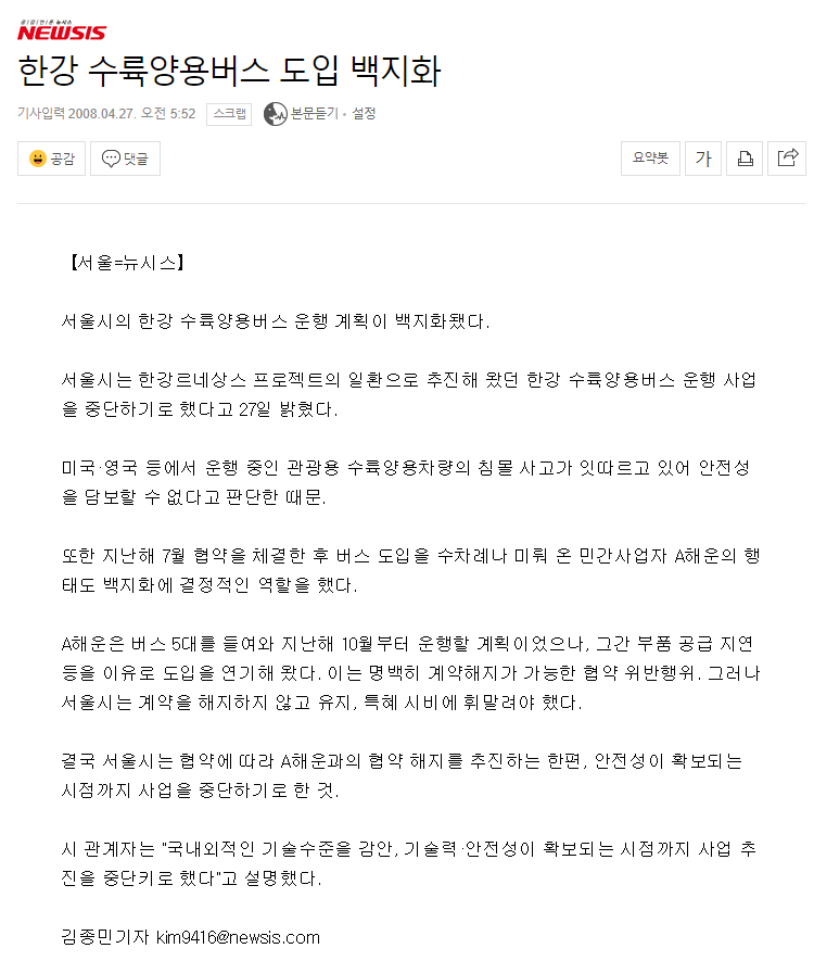 한강 수륙양용버스 도입 백지화 (뉴시스, 2008년 4월 27일)