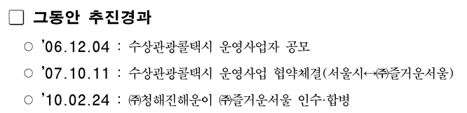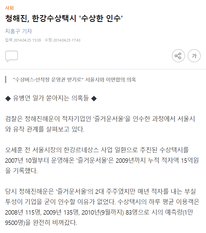 청해진해운이 서울시가 수상버스와 선착장 운영권을 주기로 한 약속을 믿고 적자 누적 상태의 '즐거운서울'을 인수했다 |
