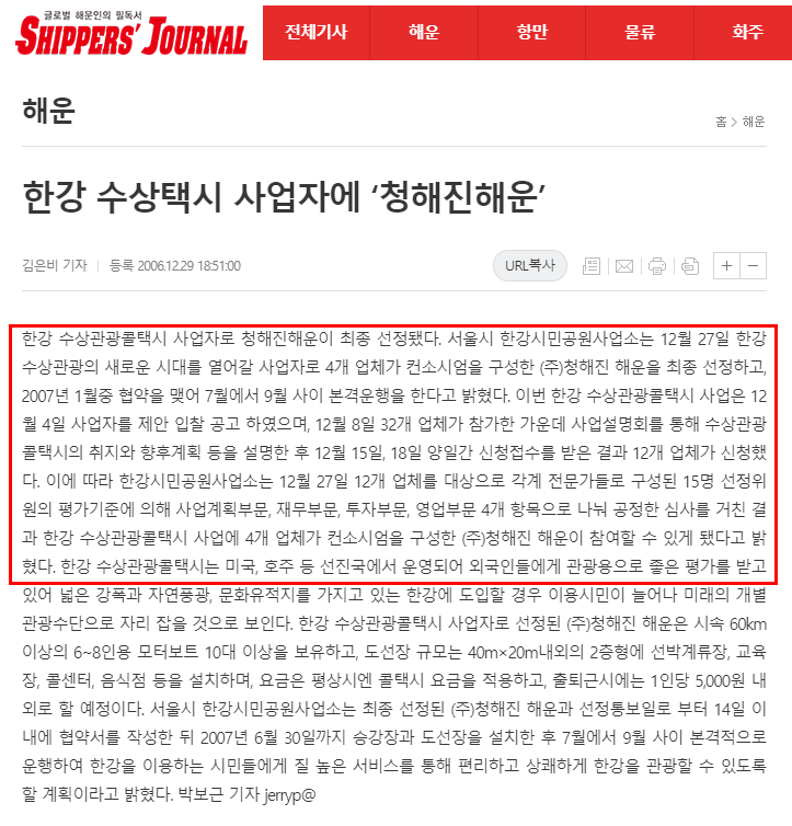 한강 수상택시 사업자에 '청해진해운' (쉬퍼저널, 2006년 12월 29일)