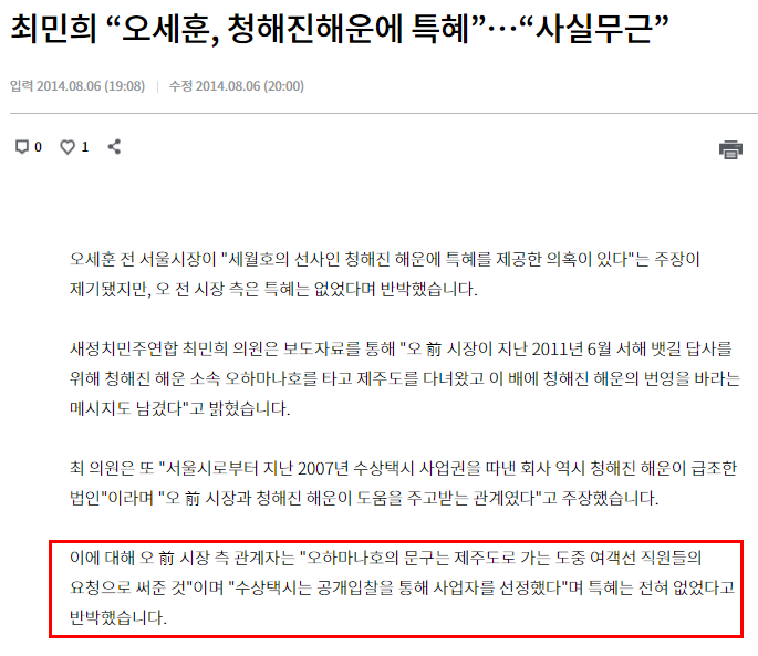 최민희 “오세훈, 청해진해운에 특혜”…“사실무근” (KBS뉴스, 2014년 8월 6일)