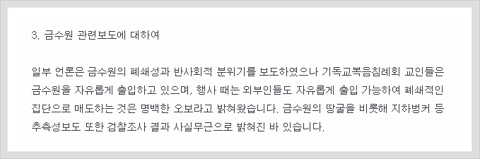Some media outlets reported on the anti-social and closed-off climate of Geumsuwon, but members of the Evangelical Laymen’s Church are free to enter Geumsuwon and visitors can freely enter during events, so it has been determined that these reports denouncing the group as closed-off are clear false reports. In addition, the results of the prosecution’s investigation have found that the speculative reports of underground tunnels and bunkers in Geumsuwon have also been found to be groundless.