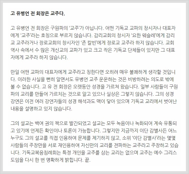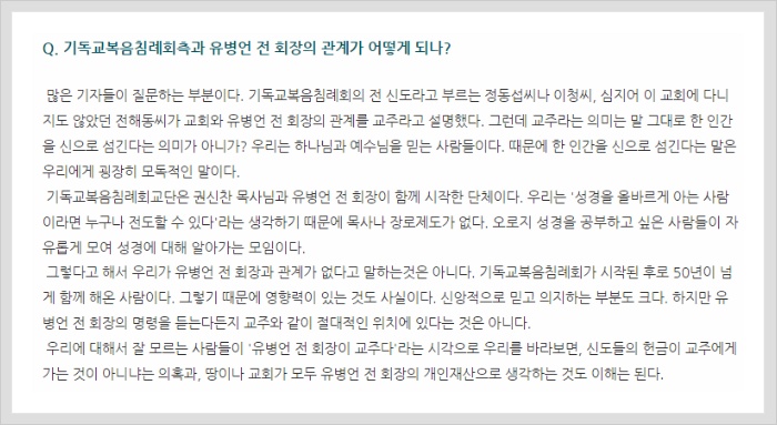 I was asked this question by a number of reporters. Jeong Dong-seob and Lee Chung, who are known to have been part of the Korean Evangelical Baptist Church, and Jeon Hae-dong who has never been to this church, described the late Chairman Yoo as the religious leader. Does it not imply that one man is worshipped as God when you refer to him as the religious leader? We are a group of people who believe in God and Jesus Christ. Therefore, to be addressed that we revere a man as God is greatly degrading for us.