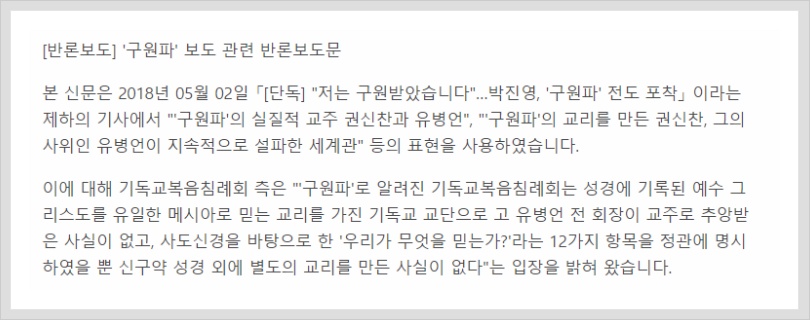In our article written on 2nd May 2018 titled 「[exclusive] “I have been saved”... Park Jin-young has been seen preaching the doctrine of the ‘Salvation group’」, there were expressions such as, “the Salvation Group’s actual religious leaders are Kwon Shin-chan and Yoo-Byung-eun,” and, “Kwon Shin-chan who created the ‘Salvation Group’s’ doctrine, and his son-in-law “Yoo Byung-eun” who has continuously taught this philosophy”. With regards to these statements, the Evangelical Baptist Church stated that according to their church’s doctrine, they believe in Jesus Christ as their only Messiah, as it is recorded in the Bible, and thus it is untrue that they have ever revered the late Former Chairman Yoo Byug-eun as a religious leader. They also stated that aside from the 12 articles based on the Apostles’ Creed called “What do we believe in?” that are listed in the Articles of Association, they have not made up any new doctrine outside of the Old and New Testaments of the Bible.