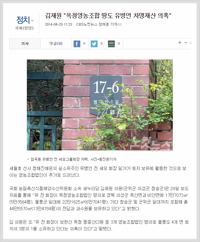 Saenuri Party Congressman Kim Jae-won (Gunwi-gun, Uiseong-gun, Cheongsong-gun), who is part of the Agriculture, Forestry, Maritime Affairs & Fisheries Committee of the National Assembly, stated in a press release on the 29th that “former Chairman Yoo owns a total of 445,570㎡ (134,784 pyung) of fields and orchards through Okchong Agricultural Cooperative. They include 177,073㎡ (53,564 pyung) of land in Oksan-myeon and Bian-myeon in Uiseong-gun, Gyeongbuk; 220,1625㎡ (67,041 pyoung) in the Ulleung-gun area; and other areas in Cheongsong-gun and Gunwi-gun.