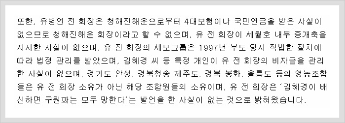 The land in Anseong, Gyeonggi-do; Cheongsong, Gyeongbuk; Jejudo; Bonghwa, Gyeongbuk; and Ulleungdo is owned by members of the respective agricultural cooperatives, not former Chairman Yoo Byung-eun. Also, it was clarified that former Chairman Yoo never stated “If Kim Hyegyung betrays us, the Salvation Group will utterly be destroyed.”