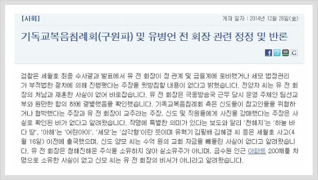 The Evangelical Baptist Church has always stated that there is no truth in the statements that any member of its congregation has threatened those testifying in court, that the Former Chairman Yoo is the church leader, or that it has ever forced sales of the pictures to its members or employees. Contrary to the reports claiming there was a special meaning behind the names, they only had their literal meaning of the word, such as “Cheonhaeji” meaning “sky, ocean, land”, “Ahae” meaning “child”, and “Semo” meaning “triangle”. Also, it has been proven that Yoo Hyuk-kee, Kim Pil-bae, and Kim Hye-kyung left the country before the incident of the Sewol ferry accident (April 16th), and it has been proven that a church member Yang has never embezzled hundreds of dollars from church funds. The Former Chairman Yoo didn’t own any shares in the Chonghaejin Marine Co. so is not a de facto owner, and he did not own the 200 condominium buildings near Geumsuwon under a borrowed name nor was Shin a secretary of the Former Chairman Yoo.