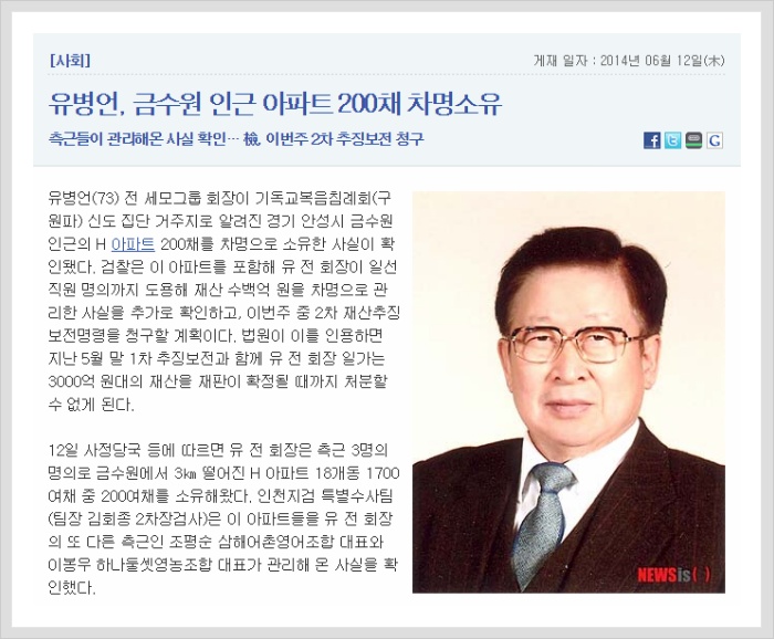 | Former Chairman Yoo Byung-eun owned around 200 condominium buildings near Geumsuwon under a borrowedname. |