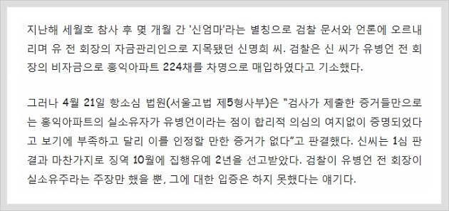 However, on April 21st, in the appeals court (Seoul High Court 5th Crimes Department) judged that “the evidence submitted by the prosecutor is insufficient to prove that Yoo Byung-eun is the de facto owner of the Hong-ik towers with reasonable doubt; in fact, no such evidence exists that can prove this claim.” As result of the appeals trial, Shin received the same sentence she received from the first trial of 10 months imprisonment with a 2 year probation period. This ultimately means the prosecution office made empty claims that Former Chairman Yoo Byung-eun was the de facto owner, without any evidence to support them.