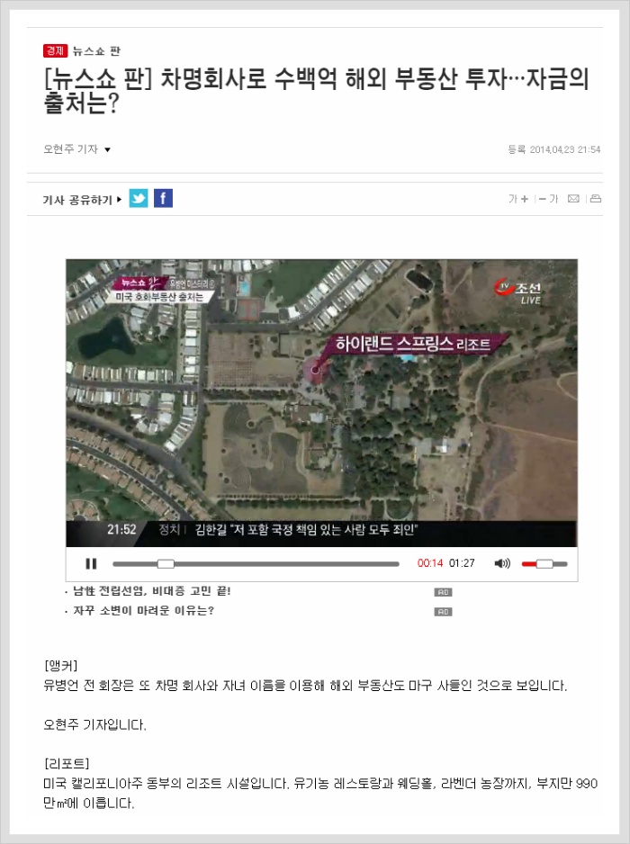 | Yoo family owns a lavender farm and Highland resort in California under a borrowed name. Semo Corp. purchased the farm nearly for 7 million dollars in 1990. Semo went into receivership in 1997,and to meet their convenience, they resorted to immorally transferring and selling ownership of the farm to Bear family hotels resort, which was the borrowed-name company of Mr. Yoo Byung-eun. |