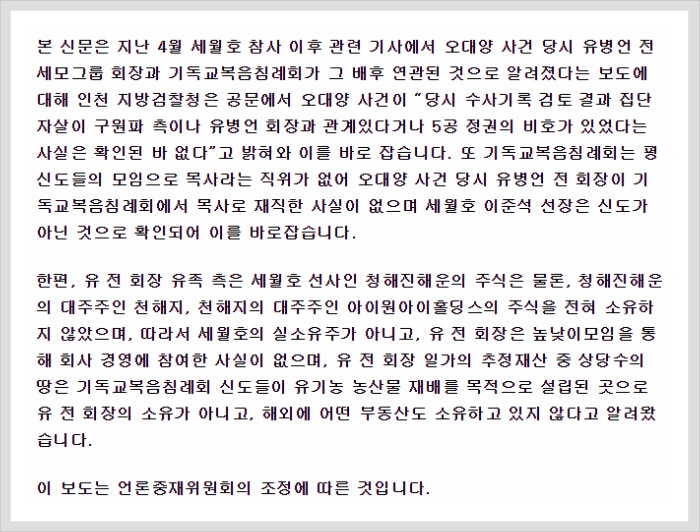 Many media outlets released false reports regarding the former chairman Yoo Byung-eun such as “Yoo family owns a lavender farm and Highland Resort in California under a borrowed name” .These false reports were either deleted or addressed by a correction or refuting report through the Press Arbitration Commission and negotiation between the press and the involved parties. Examples of false reporting are as follows.