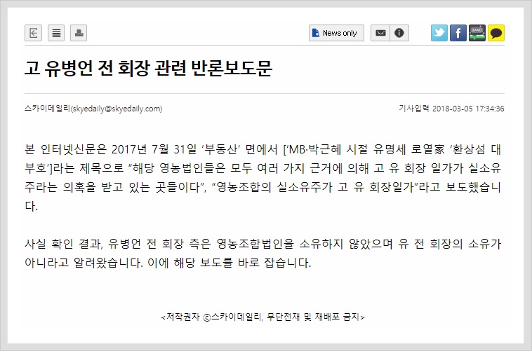 on the article written in the ‘Real Estate’ section of our internet newspaper on July 31, 2017, which was titled, “The famous royal family during the days of MB and Park Geun-hye,'Billionaire fantasy island.'” They reported that “The late Chairman Yoo’s family is suspected on many grounds of being the true owners of all of the property relating to the Agricultural Cooperative,” and “The true owner of the Agricultural Cooperative is the late Chairman Yoo’s family.” After confirming the truth, we were informed that former Chairman Yoo Byung-eun was not the owner of the Agricultural Cooperative. This will correct the report.