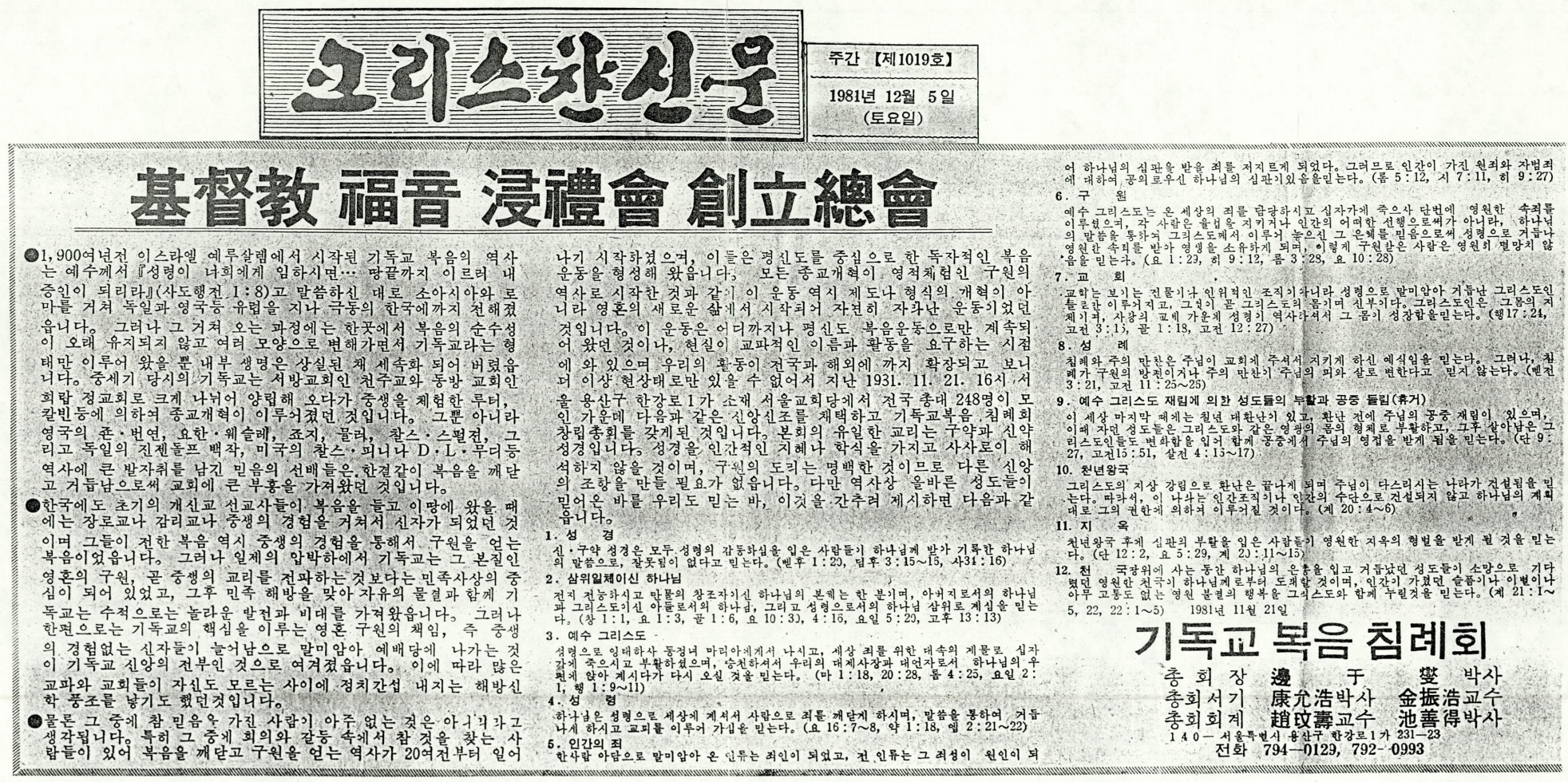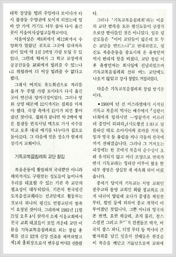 ◎ Of course, we do believe there are some true believers among them. In particular, there were those who were seeking truth, struggling between skepticism and conflicts, who eventually understood the gospel and obtained salvation. Such a history of salvation started 20 years ago and formed an independent gospel movement led by laymen. As all Reformation movements began with the history of salvation, a spiritual experience, this movement also started not through rules or formality but began naturally with a new spiritual life. Although this movement has only continued among the laymen, we are at a moment in reality that requires a denominational name and activities under such representation. As our activities span across the nation and extend across the globe, we realize we can no longer remain in this status quo. Hence, on November 21, 1981 at 4pm, at Seoul Church located in 1-ga Hangang-ro Yongsan-gu, Seoul, a total of 248 national representatives assembled and agreed on the following creeds of faith in the augural meeting of the Evangelical Baptist Church. This denomination’s only doctrine is the Old Testament and the New Testament. (Doctrine and the Creeds of Faith are omitted.)