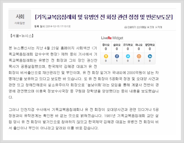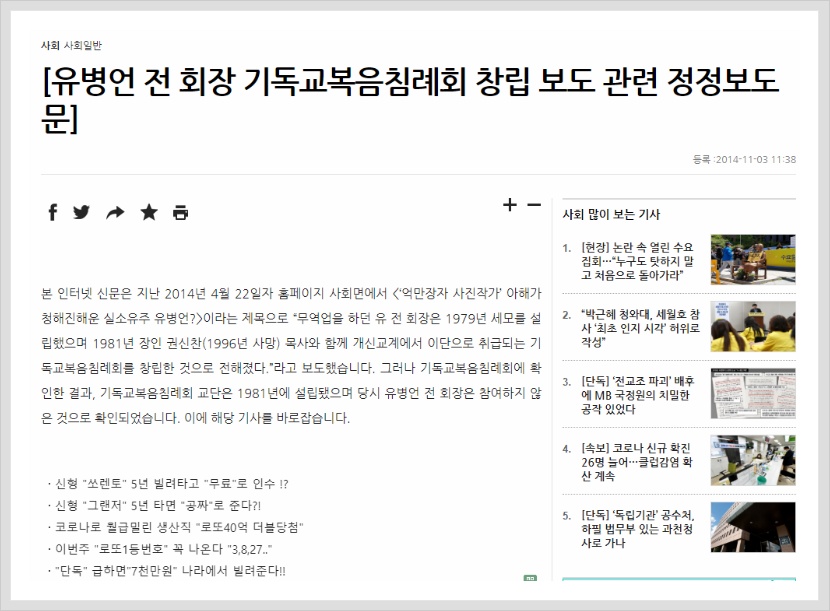 [Correction and Rebuttal Regarding Evangelical Baptist Church and former Chairman Yoo Byung-eun]