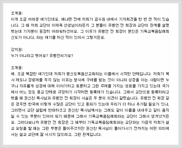 This is a little difficult. I say this because we held a press conference before, inside Geumsuwon. At the time, there were a few people including a teacher from our church, Mr. Lee Jae-ok, who explained about the relationship between Former Chairman Yoo Byung-eun and the church but the reporters found it very difficult to understand. The reason is that the Former Chairman Yoo Byung-eun said that he himself is not a member of the Evangelical Baptist Church.
