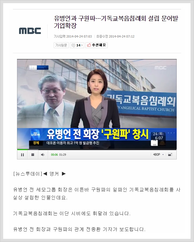 | At the time the Evangelical Baptist Church was established in 1981, Former Chairman Yoo Byung-eun was against this idea and there he never even participated as a founding member. Therefore it is untrue that the Former Chairman Yoo Byung-eun founded the EBC. |