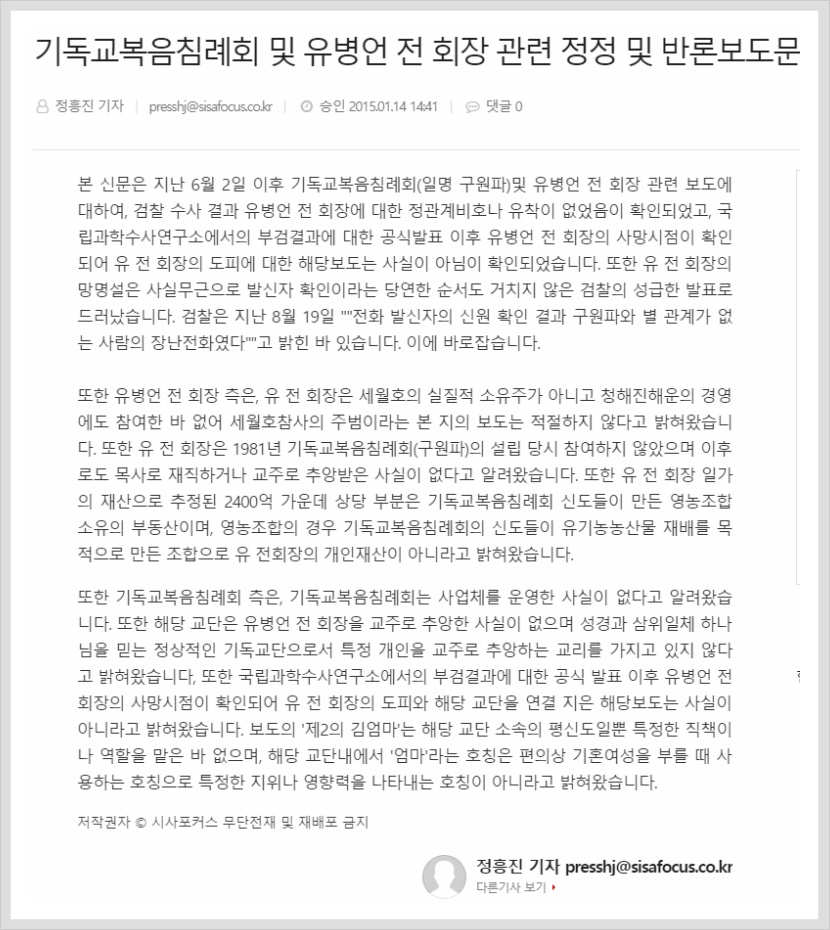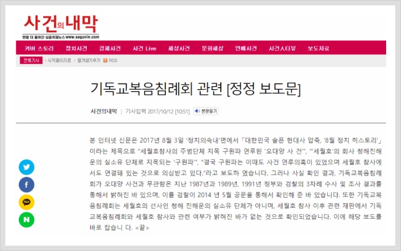 This internet newspaper published on August 3, 2017, under the title of "Compressing the Sad Modern History of Korea, "August Political History" in the aspect of "In the Politics", "Odaeyang Incident", which was involved in the salvation group, the main culprit of the Sewol ferry disaster. “Salvationists,” who are pointed out as the beneficial organization of Cheonghaejin, the company of 'Sewol', were reported, “In the end, the salvation group had suspicion of involvement in the incident, and it is suspected to be connected in the Sewol ferry disaster.” However, as a result of confirming the fact, it was revealed through the results of three investigations by the government and the prosecution in 1987, 1989, and 1991 that the Evangelical Baptist Church was irrelevant to the case of Odaeyang, and this was revealed by the prosecution through an official in May 2014. I have confirmed it. In addition, Evangelical Baptist Church is not an organization that actually owned Cheonghaejin, the company owning the Sewol ferry, and it has been confirmed that there was no evidence of a connection between Evangelical Baptist Church and the Sewol ferry disaster in a related trial after the Sewol ferry disaster. This will correct the report. <End>