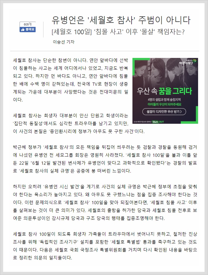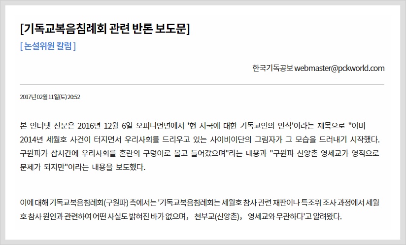On December 6, 2016, this internet newspaper published an opinion page titled 'Christians' Perceptions of the Current State', and "As the Sewol issue of 2014 broke out, the shadow of the pseudo-organization that is casting our society has been revealed It was reported that the Salvationists quickly drove our society into a pit of chaos," and "Although the small-seated religion of the Salvation Church is a spiritual problem." In response, the Evangelical Baptist Church (Salvationist) side informed us that, 'Evangelical Baptist Church has not been revealed in any case regarding the cause of the Sewol ferry disaster in the course of a trial or investigation by the Special Consortium.’