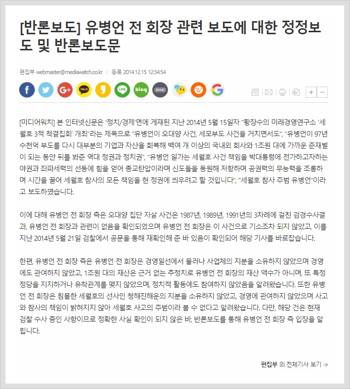 16,000여 건의 오보에 대한 정정 및 반론 보도 중에 해당 부분을 발췌한 글입니다.