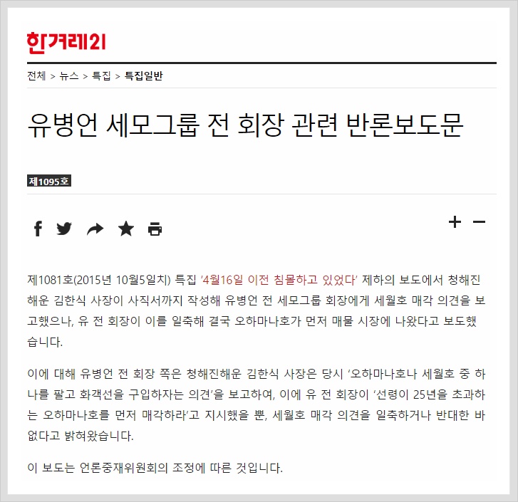 In the special feature No. 1081 (October 5th, 2015) under the heading 'It was sinking before April 16th,' it was reported that even though the President of Cheonghaejin Marine, Kim Han-sik, wrote a resignation letter and reported his suggestion to sell the Sewol ferry to former Semo Group Chairman Yoo Byung-eun, the chairman dismissed this and ultimately the Ohamana ferry was put on the market first. In response to this, representatives of the former Chairman Yoo Byung-eun revealed that at the time, President of Cheonghaejin Marine, Kim Han-sik, gave a report and ‘suggested to sell one of the Ohamana or Sewol ferries and to buy a freighter,' to which former Chairman Yoo only instructed to ‘first sell the Ohamana ferry, which was over 25 years old,’ and never dismissed or objected to the suggestion to sell the Sewol ferry. This report was revised following the Press Arbitration Commission.