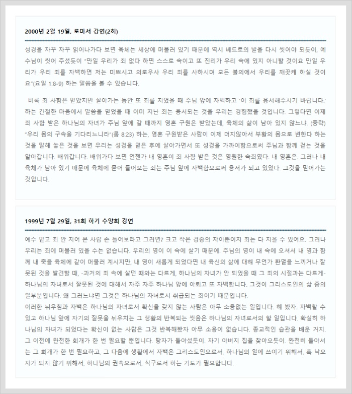 Then, the children of God have received forgiveness of their sins and received salvation of their spirits until they go before the Lord, but isn’t there still the life of the flesh left to live? (Omitted) Just as it says, “waiting for the adoption, the redemption of our body,” (Rom 8:23), if we look at how it says that those people who have received salvation of their spirits will soon be changed to a resurrected body, as we live our lives staying close to the Bible after we having come to believe in the Bible, we come to know what it means to walk with the Lord. We learn this. As you learn, one day you realize that the forgiveness of the sins of your spirit is an eternal forgiveness. Of your spirit. But because my flesh remains, the sins of the flesh are forgiven by confession in front of the Lord. You come to believe this.