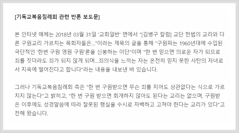 Multiple media outlets published false reports with claims related to the doctrine of the Evangelical Baptist Church, saying “Once you receive the salvation of your spirit then your body will be saved naturally.” Most of such reports have been deleted or corresponding correction reports have been published according to the order by the Press Arbitration Commission, or by the negotiation between respective agencies. The following are examples of such false reports: