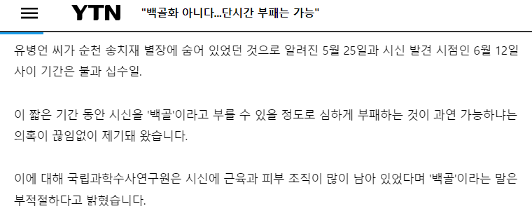 유병언 씨가 순천 송치재 별장에 숨어 있었던 것으로 알려진 5월 25일과 시신 발견 시점인 6월 12일 사이 기간은 불과 십수일. 이 짧은 기간 동안 시신을 '백골'이라고 부를 수 있을 정도로 심하게 부패하는 것이 과연 가능하냐는 의혹이 끊임없이 제기돼 왔습니다. 이에 대해 국립과학수사연구원은 시신에 근육과 피부 조직이 많이 남아 있었다며 '백골'이라는 말은 부적절하다고 밝혔습니다.