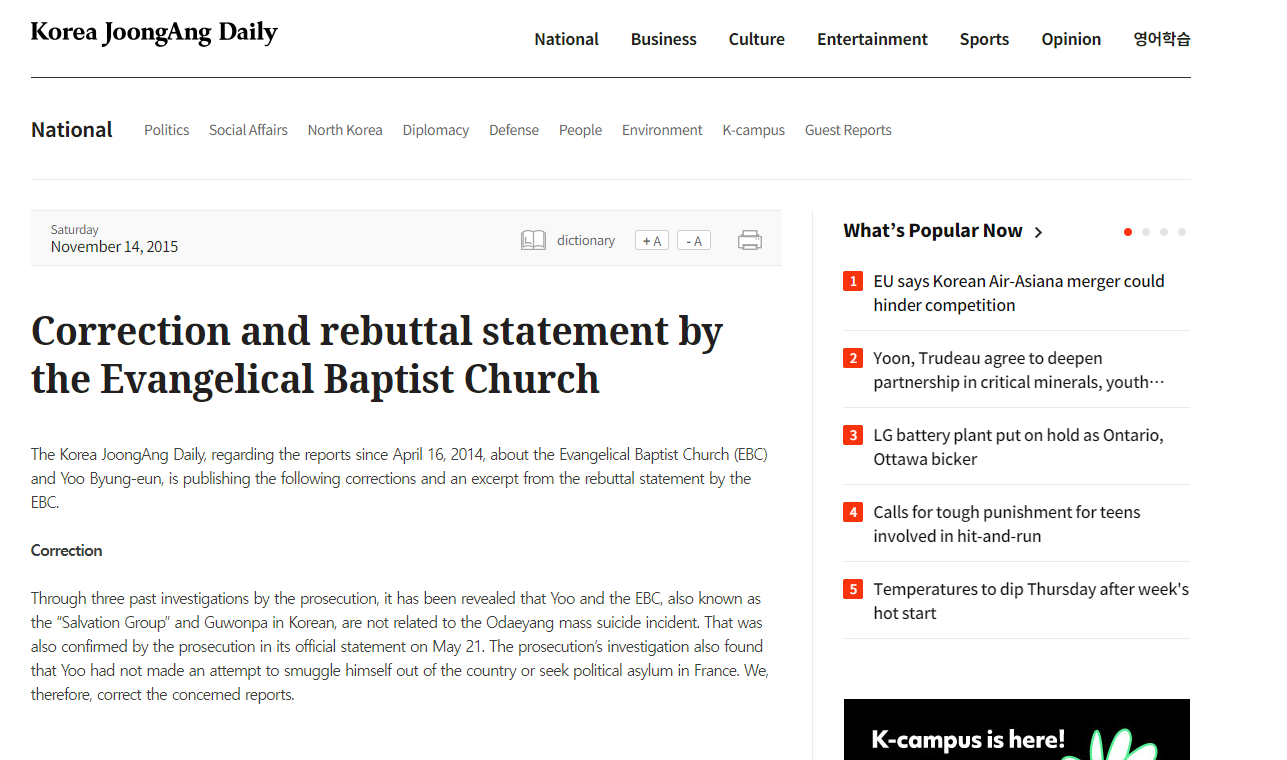 The Korea JoongAng Daily, regarding the reports since April 16, 2014, about the Evangelical Baptist Church (EBC) and Yoo Byung-eun, is publishing the following corrections and an excerpt from the rebuttal statement by the EBC.