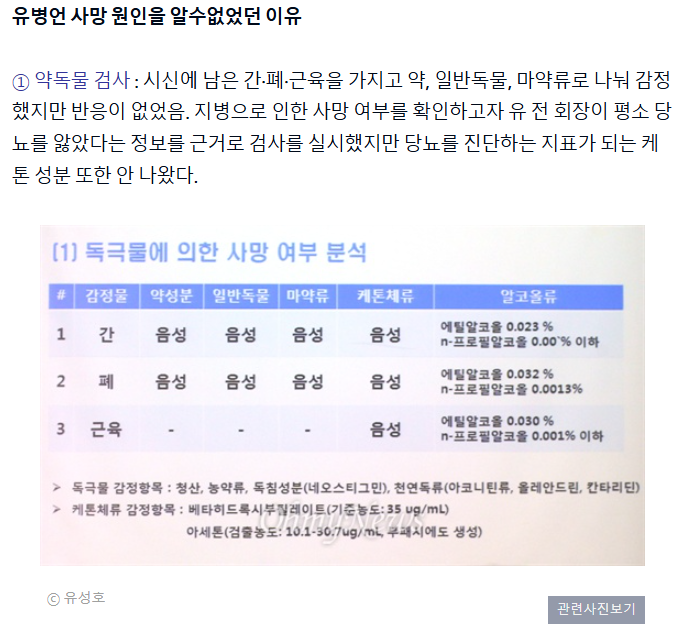 유병언 사망 원인을 알수없었던 이유 ① 약독물 검사 : 시신에 남은 간·폐·근육을 가지고 약, 일반독물, 마약류로 나눠 감정했지만 반응이 없었음. 지병으로 인한 사망 여부를 확인하고자 유 전 회장이 평소 당뇨를 앓았다는 정보를 근거로 검사를 실시했지만 당뇨를 진단하는 지표가 되는 케톤 성분 또한 안 나왔다.
