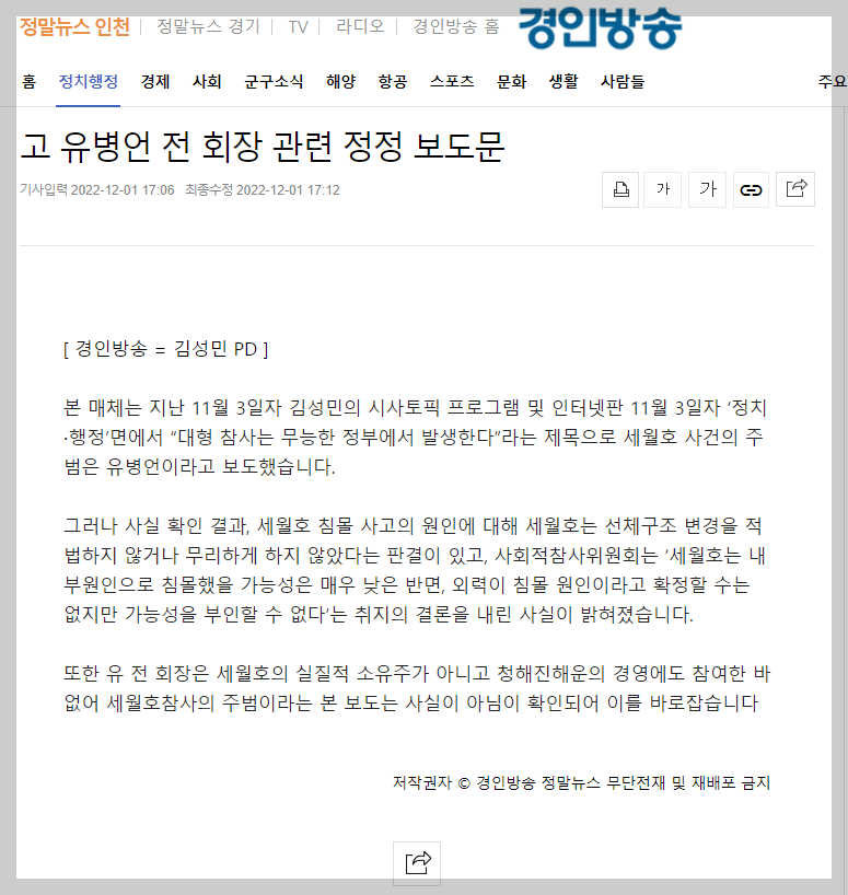 또한 유 전 회장은 세월호의 실질적 소유주가 아니고 청해진해운의 경영에도 참여한 바 없어 세월호참사의 주범이라는 본 보도는 사실이 아님이 확인되어 이를 바로잡습니다