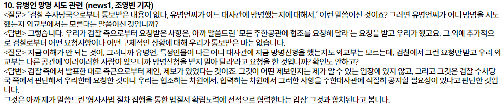 10. 유병언 망명 시도 관련  (news1, 조영빈 기자) <질문> ´검찰 수사당국으로부터 통보받은 내용이 없다, 유병언씨가 어느 대사관에 망명했는지에 대해서.´ 이런 말씀이신 것이죠? 그러면 유병언씨가 어디 망명을 시도했는지 외교부에서는 모른다는 말씀이신 것입니까? <답변> 그렇습니다. 우리가 검찰 측으로부터 요청받은 사항은, 아까 말씀드린 ´모든 주한공관에 협조를 요청해 달라´는 요청을 받고 우리가 했고요. 그 외에 추가적으로 검찰로부터 어떤 요청사항이나 어떤 구체적인 상황에 대해 우리가 통보받은 바는 없습니다. <질문> 지금 이해가 안 되는 것이, 그러니까 유병언, 특정인물이 다른 어디 대사관에 지금 망명신청을 했는지도 외교부는 모르는데, 검찰에서 그런 요청만 받고 우리 외교부는 다른 공관에 ‘이러이러한 사람이 있으니까 망명신청을 받지 말아 달라’라고 요청을 한 것입니까? 확인도 안하고? <답변> 검찰 측에서 발표한 대로 측근으로부터 제언, 제보가 있었다는 것이죠. 그것이 어떤 제보인지는 제가 알 수 있는 입장에 있지 않고, 그리고 그것은 검찰 수사당국 쪽에서 판단해서 우리한테 요청한 것이니 우리는 협조하는 차원에서, 협력하는 차원에서 그러한 사항을 주한대사관에 적절히 공지할 필요성이 있다고 판단한 것입니다.