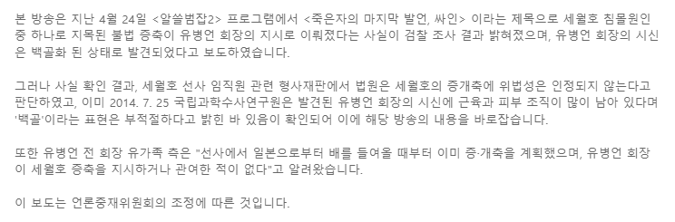 본 방송은 지난 4월 24일 <알쓸범잡2> 프로그램에서 <죽은자의 마지막 발언, 싸인> 이라는 제목으로 세월호 침몰원인 중 하나로 지목된 불법 증축이 유병언 회장의 지시로 이뤄졌다는 사실이 검찰 조사 결과 밝혀졌으며, 유병언 회장의 시신은 백골화 된 상태로 발견되었다고 보도하였습니다. 그러나 사실 확인 결과, 세월호 선사 임직원 관련 형사재판에서 법원은 세월호의 증개축에 위법성은 인정되지 않는다고 판단하였고, 이미 2014. 7. 25 국립과학수사연구원은 발견된 유병언 회장의 시신에 근육과 피부 조직이 많이 남아 있다며 '백골'이라는 표현은 부적절하다고 밝힌 바 있음이 확인되어 이에 해당 방송의 내용을 바로잡습니다. 또한 유병언 전 회장 유가족 측은 "선사에서 일본으로부터 배를 들여올 때부터 이미 증·개축을 계획했으며, 유병언 회장이 세월호 증축을 지시하거나 관여한 적이 없다"고 알려왔습니다. 이 보도는 언론중재위원회의 조정에 따른 것입니다.