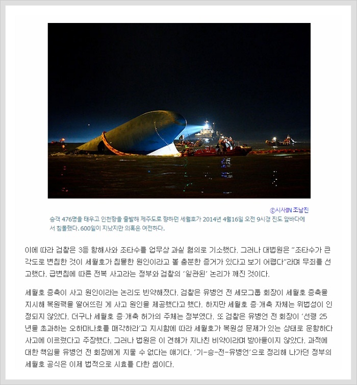 The logic that the renovation of the Sewol ferry was the cause of the accident has also become weak. The prosecution said that the cause of the accident was due to that the former Semo Group chairman Yoo Byung-eun ordered the renovations of the Sewol ferry which made it unstable. However, the expansion and renovation of the Sewol ferry itself was not recognized as being illegal. Moreover, it was the government that was responsible for permitting the Sewol ferry’s expansion and renovation. In addition, the prosecution alleged that because former Chairman Yoo Byung-eun ordered to “sell the Ohamana ferry, which is over 25 years old,” the Sewol ferry was operating while having stability problems, which resulted in the accident. However, the court said this was an excessive leap and did not accept this view. This means that former chairman Yoo Byung-eun cannot be held responsible for overload. The government's Sewol ferry formula, which used to be ‘In conclusion it is Yoo Byeung-eun’, has now reached its time limit and come to an end from a legal perspective.