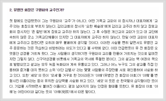 I was asked this question by a number of reporters. Jeong Dong-seob and Lee Chung, who are known to have been part of the Korean Evangelical Baptist Church, and Jeon Hae-dong who has never been to this church, described the late Chairman Yoo as the religious leader. Does it not imply that one man is worshipped as God when you refer to him as the religious leader? We are a group of people who believe in God and Jesus Christ. Therefore, to be addressed that we revere a man as God is greatly degrading for us.