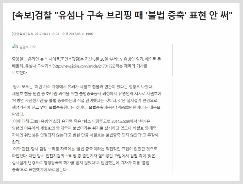 [Breaking news]. During the briefing about Yoo Somena’s arrest, Public Prosecutors' Office did not use the term “illegal expansion: On June 26th, the JoongAng Ilbo online news site (Joins.com) reported an article under the titled, “Patrimony? The Yoo Byung-eun family stole money oversaes... Yoo Somena arrested...” (http://news.joins.com/article/21701722) At the time, the report indicated that 'during the prosecution process, there was an indiciation that Yoo was related to thesinking of the Sewol ferry. It was said that the expansion work, which is one of the direct causes of the sinking of the Sewol ferry, was done by the instruction from Yoo Byung-eun to build “exhibition gallery of Yoo Byung-eun” It is said that the ship was illegally expanded with frequent changes in construction plan without reporting to the administrative agency. The report said that the cost of the illegal expansion was 165 million won. Regarding this, family of the late Chairman Yoo Byung-eun said, “In the appeal trial (Gwangju Act 2014 No 509), “the original trial is stipulating that the expansion and reconstruction of the Sewol ferry is illegal for reasons of sentencing, but the expansion and reconstruction of the Sewol ferry itself is not illegal. It has been argued that the Sewol ferry has not been expanded illegally. Regarding this matter, it was confirmed that there was no direct expression of 'illegal expansion' in the briefing data at the time. However, during the briefing of the Incheon District Prosecutor's Office, in the process of answering questions to reporters, the prosecution replied that “there was not permission from the administrative authorities due to frequent changes to the construction plan,” but we are correcting this expression as the reporter expressed as “illegal expansion”.