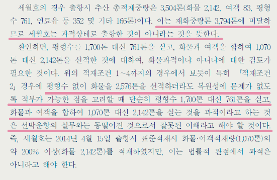 왜냐하면 선박은 항상 표준상태로만 적재를 하는 것이 아닐뿐더러 과적이란 화물, 평형수, 연료 등을 합한 총 적재중량이 이것을 초과한다는 의미인데 각종 사고분석자료를 보면, 세월호의 출항당시와 사고당시에도 재화중량톤 수2)에 미치지 않기 때문이다.