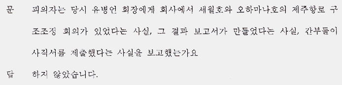 | 유병언 전 회장 쪽은 청해진해운 김한식 사장은 당시 ‘오하마나호나 세월호 중 하나를 팔고 화객선을 구입하자는 의견’을 보고하여, 이에 유 전 회장이 ‘선령이 25년을 초과하는 오하마나호를 먼저 매각하라’고 지시했을 뿐, 세월호 매각 의견을 일축하거나 반대한 바 없다. 실제 검찰 조사에서 김한식 사장은 사직서나 세월호와 오하마나호의 제주항로 구조조정안을 가지고 들어가기만 했을 뿐 제출하지도 않았고, 구체적으로 해당 문제에 대해 언급하지도 않았다고 진술한 것으로 확인되었다. |
