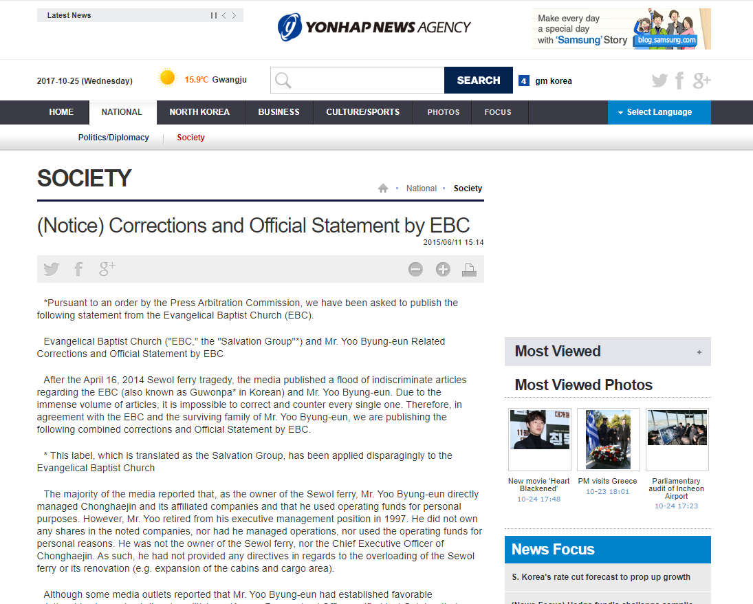 Evangelical Baptist Church ("EBC," the "Salvation Group"*) and Mr. Yoo Byung-eun Related Corrections and Official Statement by EBC